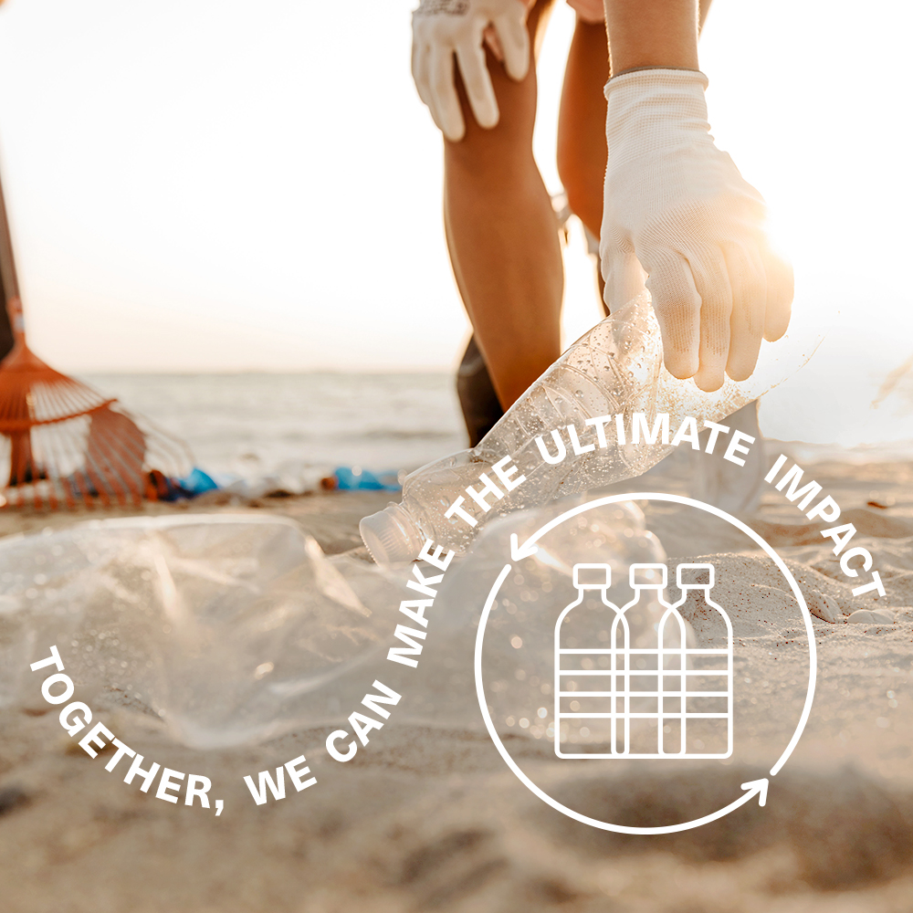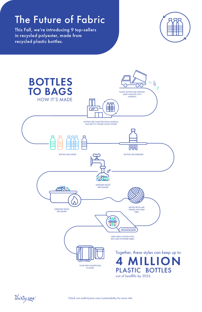 Infographic featuring recycled fabric process from collection of recycled plastic bottles to final product.